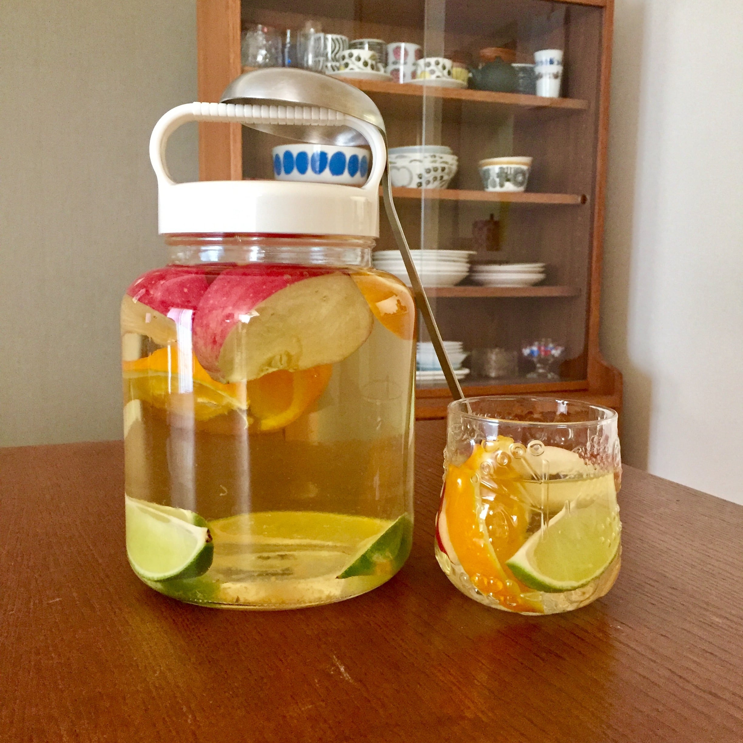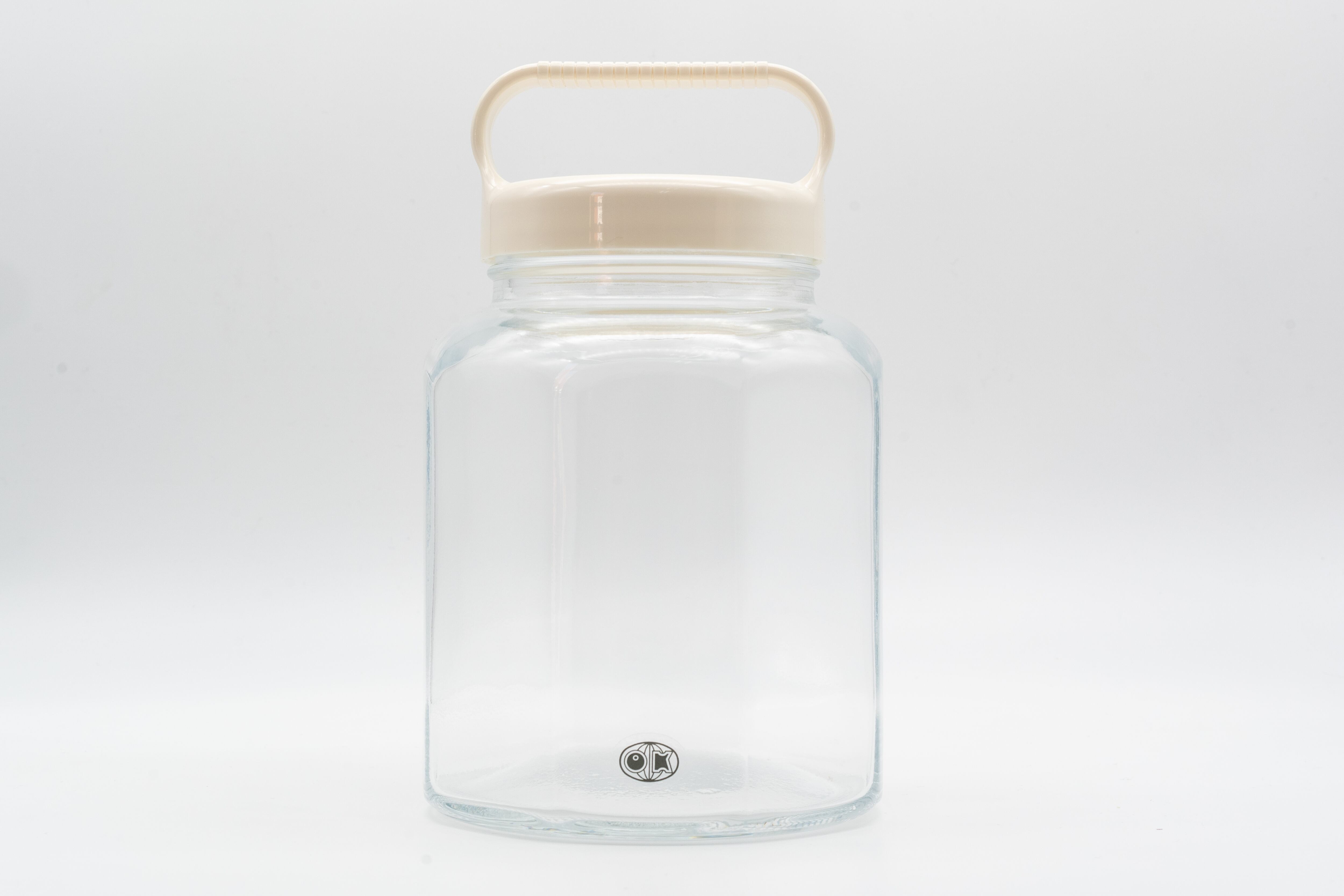 蜂蜜が2kg入る容器として、1976年より養蜂場向けに発売が開始されました。キャップには持ち手が付いているので、手さげの様に簡単に持ち運ぶことができます。また広口で大容量なので、果実酒作りや粉物のストッカーとしても重宝します。(専用化粧箱入り)